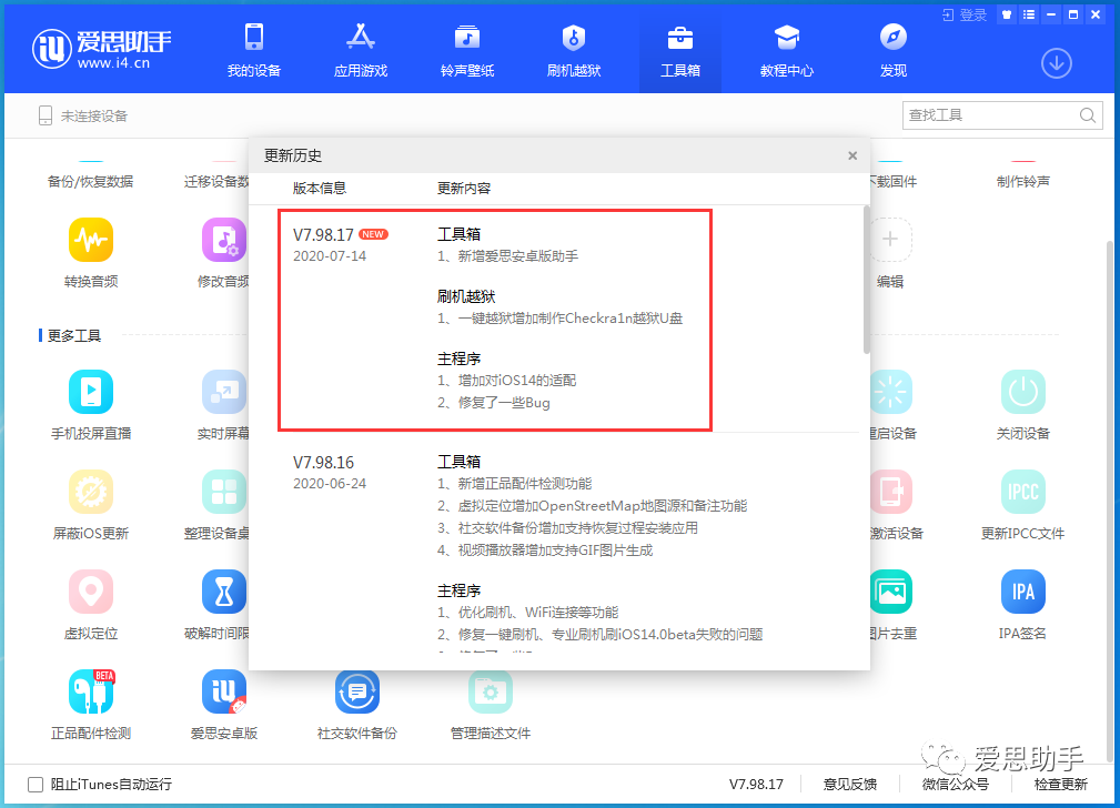 - 越狱功能:对于需要越狱的用户,爱思助手提供了一键越狱功能,支持多种越狱工具和越狱方法。用户应确保理解越狱的风险,并按照软件提供的指南操作。