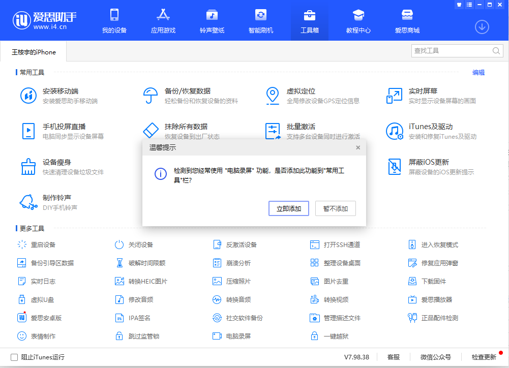 - 打开录屏工具: 在爱思助手主界面中,选择“更多工具”选项卡,然后找到并点击“录屏大师”启动录屏功能。