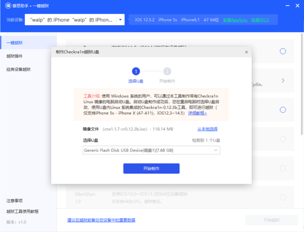 - 选择制作越狱U盘选项:在爱思助手的主界面中,找到越狱功能或工具箱部分,选择“制作越狱U盘”或类似选项。这通常位于软件的高级功能区域。
