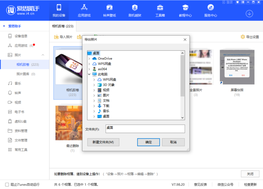 - 导出设置:在选择了需要导出的照片后,点击“导出”按钮,并在弹出的窗口中选择导出的目标文件夹以及所需的文件格式和质量。确认设置后,爱思助手会批量将照片保存到指定的电脑路径。