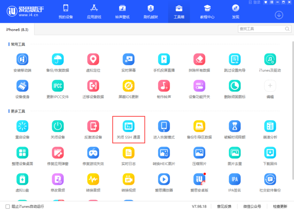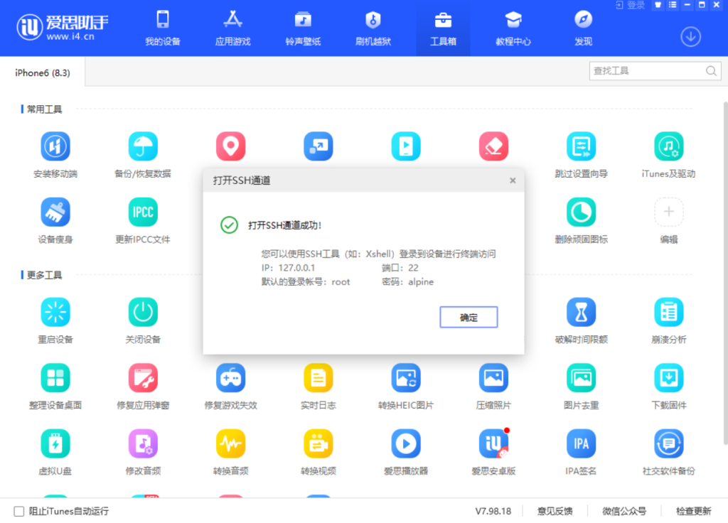 - 进入工具箱选择SSH通道:在爱思助手的主界面中,找到“工具箱”或类似的菜单选项,并选择“打开SSH通道”。这一选项专门用于启动和管理SSH连接。